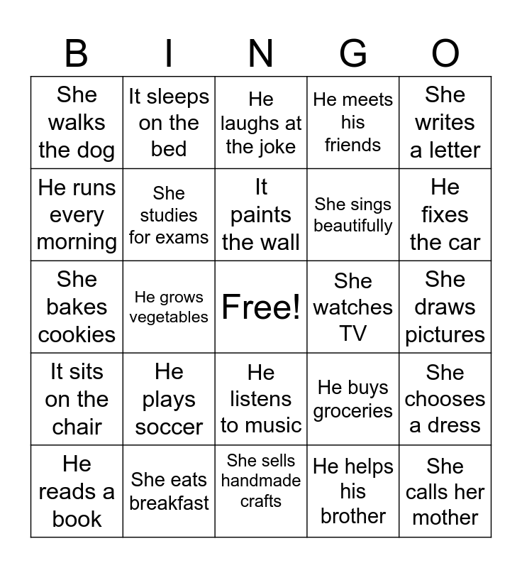 This bingo card has a free space and 24 words: He plays soccer, She eats breakfast, It paints the wall, He reads a book, She writes a letter, She walks the dog, He runs every morning, It sleeps on the bed, She watches TV, He listens to music, She sings beautifully, She bakes cookies, He buys groceries, She chooses a dress, She studies for exams, He helps his brother, She draws pictures, He laughs at the joke, He fixes the car, He grows vegetables, She calls her mother, It sits on the chair, He meets his friends and She sells handmade crafts.