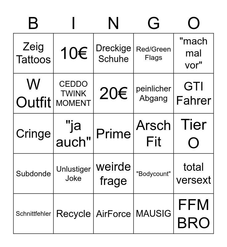 This bingo card has a free space and 24 words: Unlustiger Joke, Recycle, 20€, Schnittfehler, "mach mal vor", Zeig Tattoos, W Outfit, 10€, Arsch Fit, weirde frage, peinlicher Abgang, Cringe, "Bodycount", total versext, CEDDO TWINK MOMENT, MAUSIG, Tier O, Dreckige Schuhe, GTI Fahrer, "ja auch", FFM BRO, Subdonde, Red/Green Flags and AirForce.