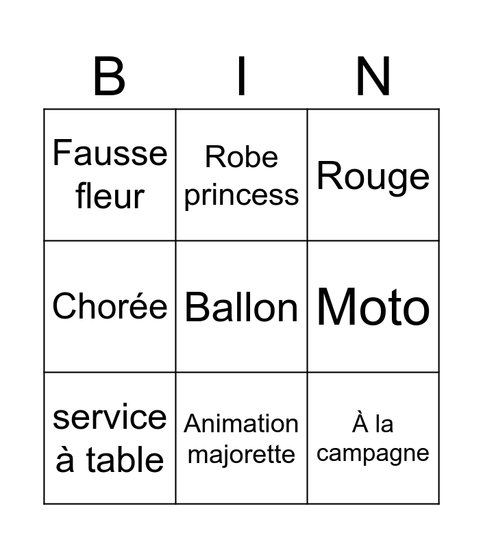 This bingo card has a free space and 8 words: Moto, Rouge, Robe princess, service à table, Fausse fleur, À la campagne, Chorée and Animation majorette.