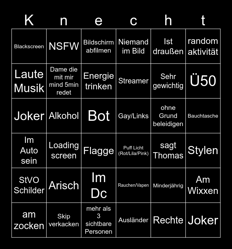 This bingo card has 36 words: Rauchen/Vapen, Im Dc, Ausländer, Laute Musik, Im Auto sein, Gay/Links, Dame die mit mir mind 5min redet, mehr als 3 sichtbare Personen, Ist draußen, Minderjährig, Ü50, Niemand im Bild, Am Wixxen, Alkohol, Streamer, Blackscreen, StVO Schilder, ohne Grund beleidigen, Joker, Bildschirm abfilmen, Bot, Loading screen, Puff Licht (Rot/Lila/Pink), Flagge, sagt Thomas, NSFW, Sehr gewichtig, Skip verkacken, Energie trinken, random aktivität, Joker, am zocken, Stylen, Bauchtasche, Arisch and Rechte.