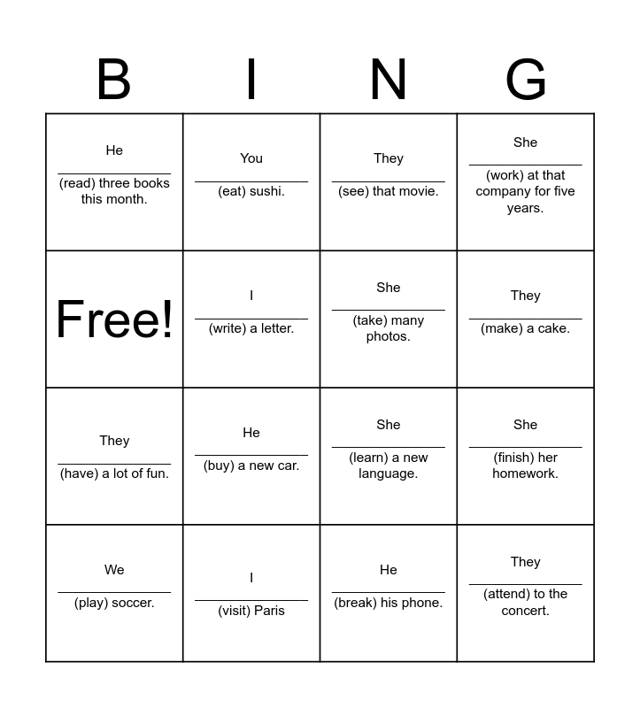 This bingo card has 16 words: I _______________ (visit) Paris, She _______________ (finish) her homework., They _______________ (see) that movie., He _______________ (read) three books this month., They _______________ (have) a lot of fun., You _______________ (eat) sushi., She _______________ (learn) a new language., He _______________ (break) his phone., Free!, I _______________ (write) a letter., We _______________ (play) soccer., She _______________ (work) at that company for five years., He _______________ (buy) a new car., They _______________ (make) a cake., She _______________ (take) many photos. and They _______________ (attend) to the concert..