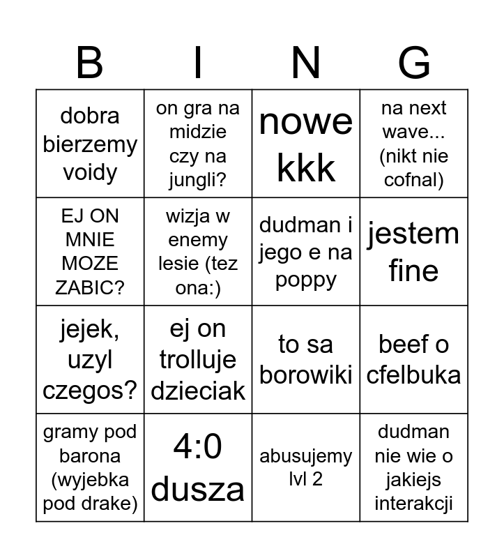 This bingo card has 16 words: 4:0 dusza, beef o cfelbuka, nowe kkk, dobra bierzemy voidy, jejek, uzyl czegos?, on gra na midzie czy na jungli?, to sa borowiki, abusujemy lvl 2, EJ ON MNIE MOZE ZABIC?, wizja w enemy lesie (tez ona:), gramy pod barona (wyjebka pod drake), na next wave... (nikt nie cofnal), ej on trolluje dzieciak, jestem fine, dudman i jego e na poppy and dudman nie wie o jakiejs interakcji.