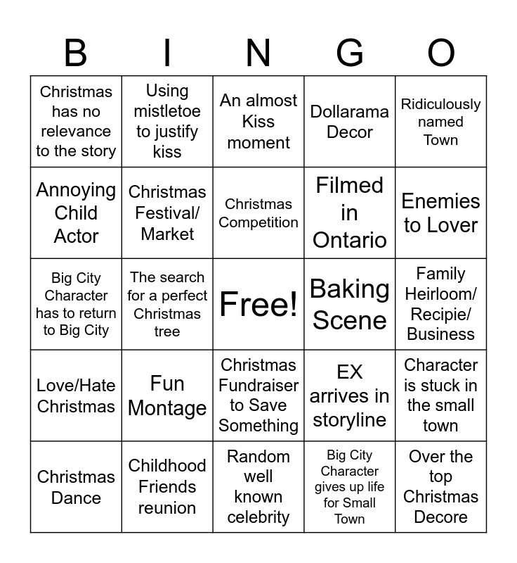 This bingo card has a free space and 39 words: Big City Slicker vs Small Town Charm, Characrter named Nick or Holly, Red or Green Clothing, Christmas Festival/ Market, Christmas Dance, Christmas Fundraiser to Save Something, Christmas Competition, Something needs to be saved, Ridiculously named Town, Love/Hate Christmas, The search for a perfect Christmas tree, Dollarama Decor, Over the top Christmas Decore, Family Heirloom/ Recipie/ Business, Baking Scene, Fun Montage, Santa Clause reference, Christmas has no relevance to the story, A lie about something, EX arrives in storyline, Annoying Child Actor, Random well known celebrity, Filmed in Ontario, Enemies to Lover, Faking Dating Trope, More than 3 wreaths in one scene, Garland over the window, Magic Component, Being under mistletoe at end of movie, Using mistletoe to justify kiss, Fake Snow, Small Town Character owns a ridiculous store, An almost Kiss moment, Childhood Friends reunion, Big City Character gives up life for Small Town, An annoying best friend/ side character, Character is stuck in the small town, Big City Character has to return to Big City and Big Surprise Moment.