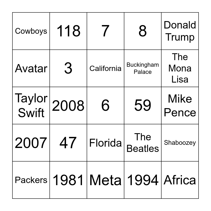 This bingo card has 39 words: Salem, Cars, Horses, 3, Packers, Florida, California, Joe Biden, Donald Trump, 2007, 2008, 8, 6, Mike Pence, 59, 47, Steelers, Cowboys, Bucs, The Beatles, Avatar, Meta, Buckingham Palace, The Mona Lisa, Nixon, Taft, Africa, South America, 2, 118, 116, ton, 7, 1981, 1994, 13, Shaboozey, Taylor Swift and 2010.
