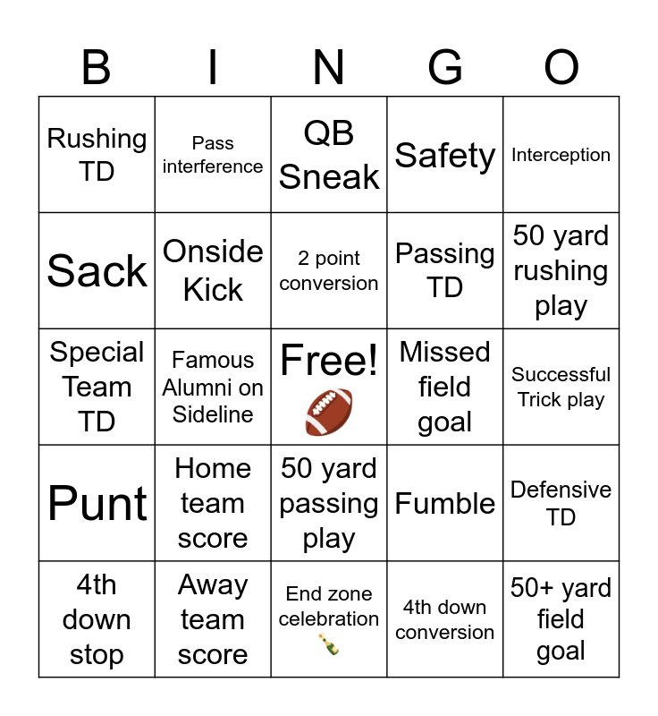 This bingo card has a free space and 24 words: Home team score, Away team score, 2 point conversion, 4th down stop, Interception, Rushing TD, Sack, Pass interference, Missed field goal, 50 yard passing play, Passing TD, Special Team TD, Fumble, Defensive TD, Onside Kick, 4th down conversion, Successful Trick play, QB Sneak, 50 yard rushing play, Famous Alumni on Sideline, 50+ yard field goal, Punt, Safety and End zone celebration 🍾.