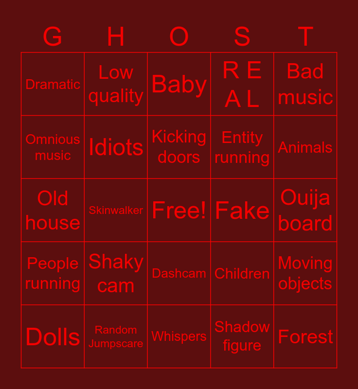 This bingo card has a free space and 24 words: Shaky cam, Random Jumpscare, Kicking doors, Dolls, Bad music, Dramatic, Omnious music, Low quality, Fake, Dashcam, Entity running, Old house, Children, Moving objects, Idiots, Shadow figure, Ouija board, Baby, Animals, Skinwalker, Forest, People running, R E A L and Whispers.