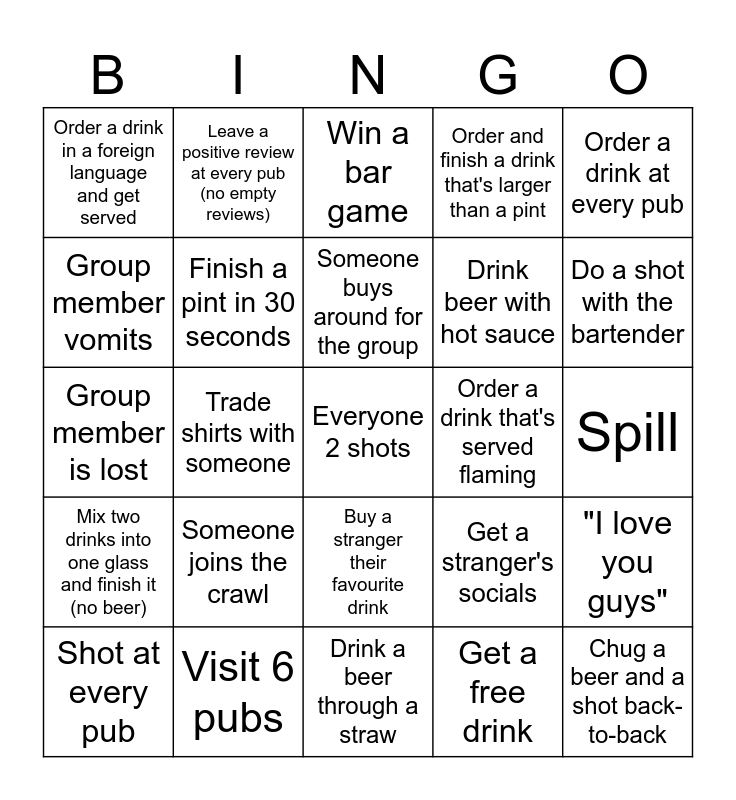 This bingo card has a free space and 24 words: Someone joins the crawl, Visit 6 pubs, Someone buys around for the group, Shot at every pub, Order a drink at every pub, Order a drink in a foreign language and get served, Group member vomits, Leave a positive review at every pub (no empty reviews), Order a drink that's served flaming, Buy a stranger their favourite drink, Drink beer with hot sauce, Group member is lost, Get a stranger's socials, "I love you guys", Finish a pint in 30 seconds, Get a free drink, Spill, Win a bar game, Do a shot with the bartender, Trade shirts with someone, Chug a beer and a shot back-to-back, Mix two drinks into one glass and finish it (no beer), Order and finish a drink that's larger than a pint and Drink a beer through a straw.