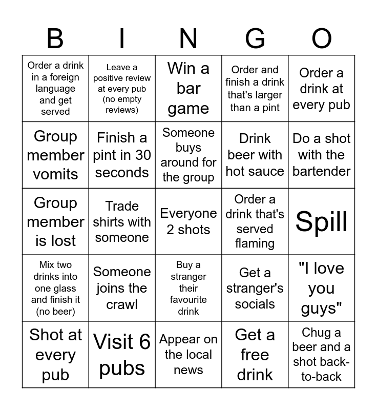 This bingo card has a free space and 24 words: Someone joins the crawl, Visit 6 pubs, Someone buys around for the group, Shot at every pub, Order a drink at every pub, Order a drink in a foreign language and get served, Group member vomits, Leave a positive review at every pub (no empty reviews), Order a drink that's served flaming, Buy a stranger their favourite drink, Drink beer with hot sauce, Group member is lost, Get a stranger's socials, "I love you guys", Finish a pint in 30 seconds, Get a free drink, Spill, Win a bar game, Do a shot with the bartender, Trade shirts with someone, Chug a beer and a shot back-to-back, Mix two drinks into one glass and finish it (no beer), Order and finish a drink that's larger than a pint and Appear on the local news.