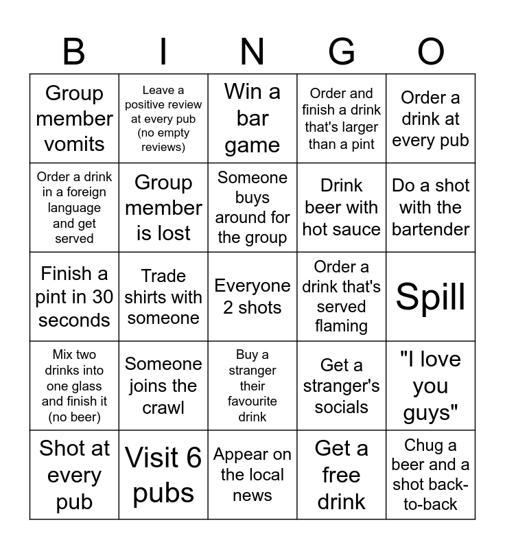This bingo card has a free space and 24 words: Someone joins the crawl, Visit 6 pubs, Someone buys around for the group, Shot at every pub, Order a drink at every pub, Group member vomits, Order a drink in a foreign language and get served, Leave a positive review at every pub (no empty reviews), Order a drink that's served flaming, Buy a stranger their favourite drink, Drink beer with hot sauce, Finish a pint in 30 seconds, Get a stranger's socials, "I love you guys", Group member is lost, Get a free drink, Spill, Win a bar game, Do a shot with the bartender, Trade shirts with someone, Chug a beer and a shot back-to-back, Mix two drinks into one glass and finish it (no beer), Order and finish a drink that's larger than a pint and Appear on the local news.