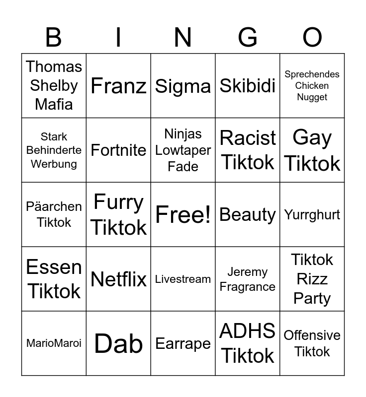 This bingo card has a free space and 24 words: MarioMaroi, Netflix, Ninjas Lowtaper Fade, ADHS Tiktok, Sprechendes Chicken Nugget, Thomas Shelby Mafia, Franz, Sigma, Beauty, Yurrghurt, Päarchen Tiktok, Fortnite, Jeremy Fragrance, Tiktok Rizz Party, Stark Behinderte Werbung, Dab, Earrape, Skibidi, Gay Tiktok, Essen Tiktok, Furry Tiktok, Livestream, Racist Tiktok and Offensive Tiktok.