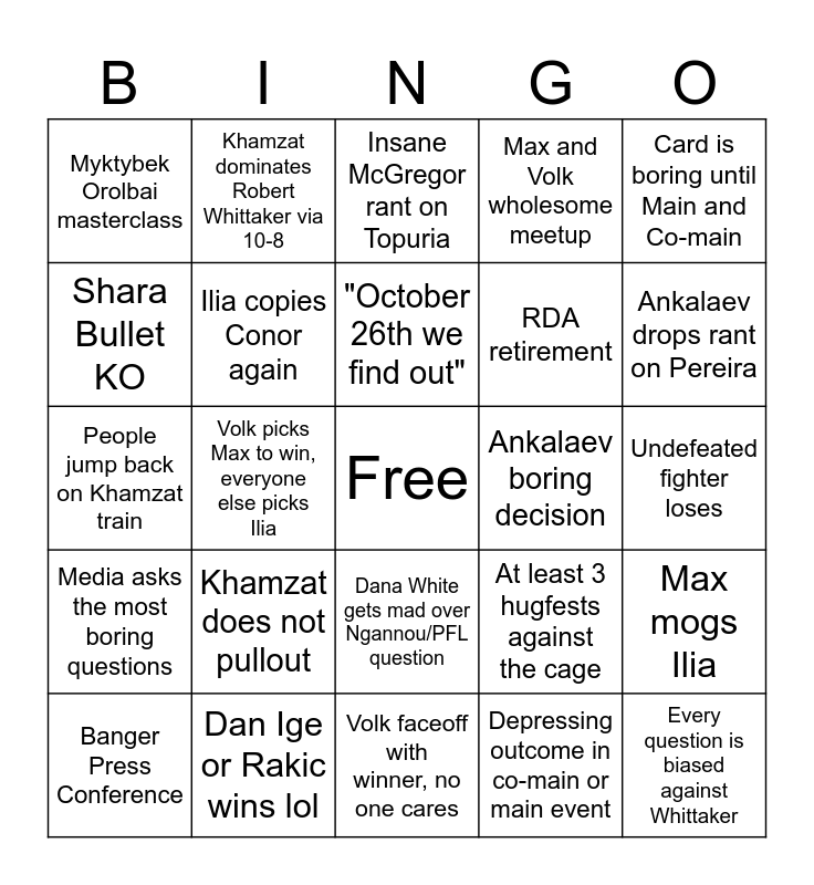 This bingo card has a free space and 24 words: Khamzat does not pullout, Dan Ige or Rakic wins lol, "October 26th we find out", Banger Press Conference, Card is boring until Main and Co-main, Myktybek Orolbai masterclass, Shara Bullet KO, Khamzat dominates Robert Whittaker via 10-8, Ankalaev boring decision, Dana White gets mad over Ngannou/PFL question, RDA retirement, People jump back on Khamzat train, At least 3 hugfests against the cage, Max mogs Ilia, Ilia copies Conor again, Depressing outcome in co-main or main event, Undefeated fighter loses, Insane McGregor rant on Topuria, Ankalaev drops rant on Pereira, Volk picks Max to win, everyone else picks Ilia, Every question is biased against Whittaker, Media asks the most boring questions, Max and Volk wholesome meetup and Volk faceoff with winner, no one cares.