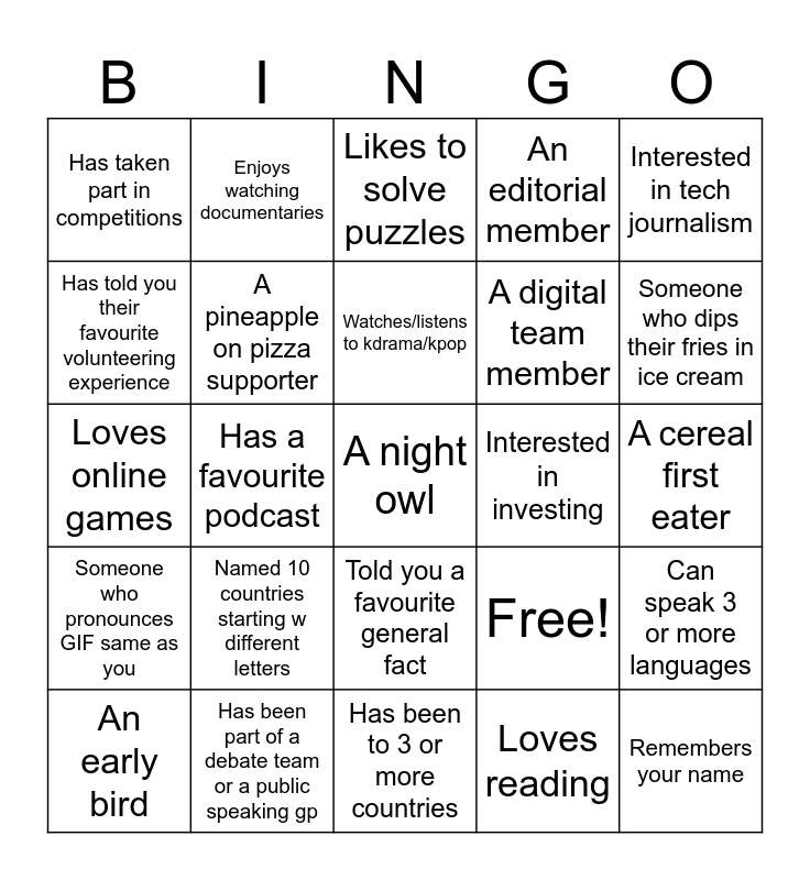 This bingo card has 25 words: Named 10 countries starting w different letters, Has been to 3 or more countries, Watches/listens to kdrama/kpop, An early bird, Interested in tech journalism, Has taken part in competitions, Has told you their favourite volunteering experience, Enjoys watching documentaries, Interested in investing, Told you a favourite general fact, A digital team member, Loves online games, Free!, Can speak 3 or more languages, A pineapple on pizza supporter, Remembers your name, A cereal first eater, Likes to solve puzzles, Someone who dips their fries in ice cream, Has a favourite podcast, A night owl, Has been part of a debate team or a public speaking gp, Someone who pronounces GIF same as you, An editorial member and Loves reading.