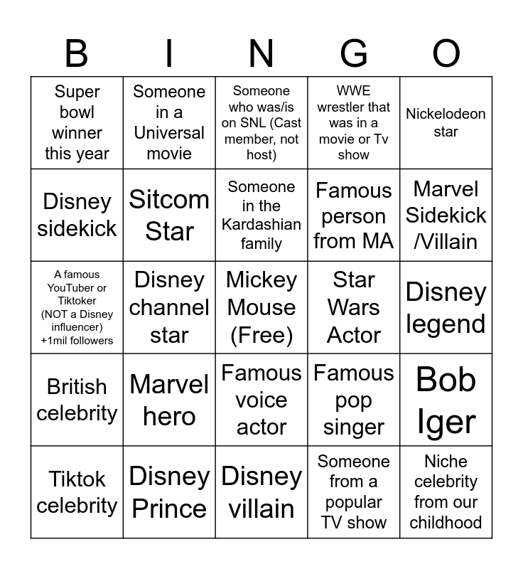 This bingo card has a free space and 24 words: Marvel hero, Disney Prince, Someone in the Kardashian family, Tiktok celebrity, Nickelodeon star, Super bowl winner this year, Disney sidekick, Someone in a Universal movie, Star Wars Actor, Famous voice actor, Famous person from MA, A famous YouTuber or Tiktoker (NOT a Disney influencer) +1mil followers, Famous pop singer, Bob Iger, Sitcom Star, Someone from a popular TV show, Disney legend, Someone who was/is on SNL (Cast member, not host), Marvel Sidekick /Villain, Disney channel star, Niche celebrity from our childhood, British celebrity, WWE wrestler that was in a movie or Tv show and Disney villain.