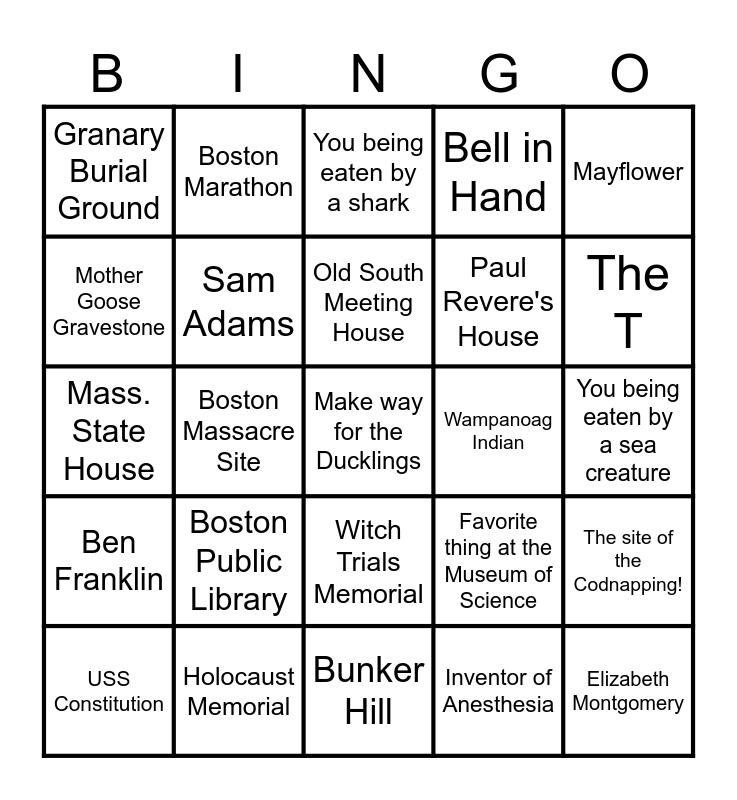 This bingo card has 56 words: Witch Dungeon Museum, USS Constitution, March on the Boston Common, Granary Burial Ground, Bunker Hill, Duncan Donuts, Sam Adams, Plymouth Rock, Paul Revere's House, Red Sox Logo, Bell in Hand, Throw tea overbard, Park Street Church, Potato Famine Memorial, Gallows Hill Theater, Paul Revere, Mayflower, Boston Massacre Site, Faneuil Hall, Make way for the Ducklings, Wampanoag Indian, Pilgrim, Favorite thing at the Museum of Science, You being eaten by a shark, Shaw Memorial, Old South Meeting House, Old North Church, Cannoli Shop, The T, Lunch at Quincy Market, Bruins Jersey, Old State House, Your bus driver, Your Jassby card, You being eaten by a sea creature, Mother Goose Gravestone, Mass. State House, Kings Chapel, Ben Franklin, Boston Marathon, Witch Trials Memorial, Elizabeth Montgomery, Donkey Statue, Ann Hutcinson, Mary Dyer, Boston Public Library, Holocaust Memorial, Crazy Hat, Boston Cream Pie, Parker House Hote, Inventor of Anesthesia, Lobster Roll, You being chased by a lobster, A new thing you learned, The site of the Codnapping! and Freedom Trail.