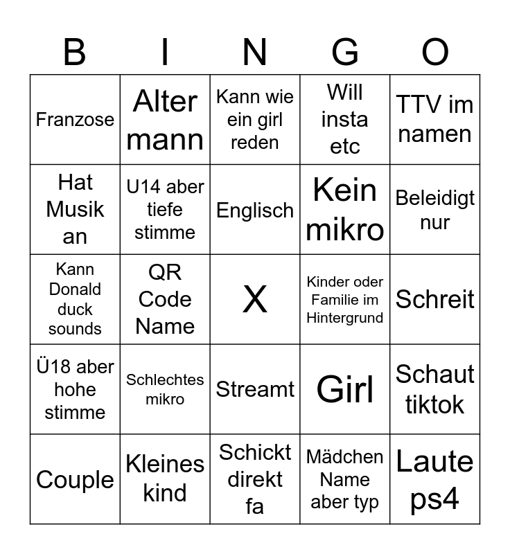 This bingo card has a free space and 24 words: Schlechtes mikro, Kleines kind, Englisch, Couple, TTV im namen, Franzose, Hat Musik an, Alter mann, Kinder oder Familie im Hintergrund, Streamt, Kein mikro, Kann Donald duck sounds, Girl, Schaut tiktok, U14 aber tiefe stimme, Mädchen Name aber typ, Schreit, Kann wie ein girl reden, Beleidigt nur, QR Code Name, Laute ps4, Ü18 aber hohe stimme, Will insta etc and Schickt direkt fa.