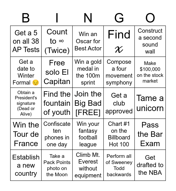 This bingo card has a free space and 24 words: Confiscate ten phones in one day, Take a Pack Points photo on the Moon, Win a gold medal in the 100m sprint, Establish a new country, Construct a second sound wall, Get a 5 on all 38 AP Tests, Get a date to Winter Formal 😔, Count to ∞ (Twice), Get a club approved, Win your fantasy football league, Compose a four movement symphony, Obtain a President's signature (Dead or Alive), Chart #1 on the Billboard Hot 100, Pass the Bar Exam, Free solo El Capitan, Perform all of Sweeney Todd backwards, Tame a unicorn, Win an Oscar for Best Actor, Make $100,000 on the stock market, Find the fountain of youth, Get drafted to the NBA, Win the Tour de France, Find 𝓍 and Climb Mt. Everest without equipment.