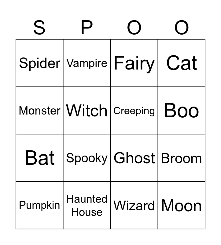 This bingo card has 16 words: Haunted House, Broom, Fairy, Spider, Bat, Vampire, Ghost, Wizard, Monster, Witch, Pumpkin, Cat, Spooky, Boo, Creeping and Moon.