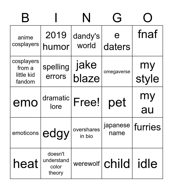 This bingo card has a free space and 25 words: edgy, werewolf, jake blaze, heat, fnaf, anime cosplayers, cosplayers from a little kid fandom, 2019 humor, pet, overshares in bio, omegaverse, emo, japanese name, furries, spelling errors, pick me/Mary Sue, my au, dandy's world, my style, dramatic lore, idle, doesn't understand color theory, emoticons, e daters and child.