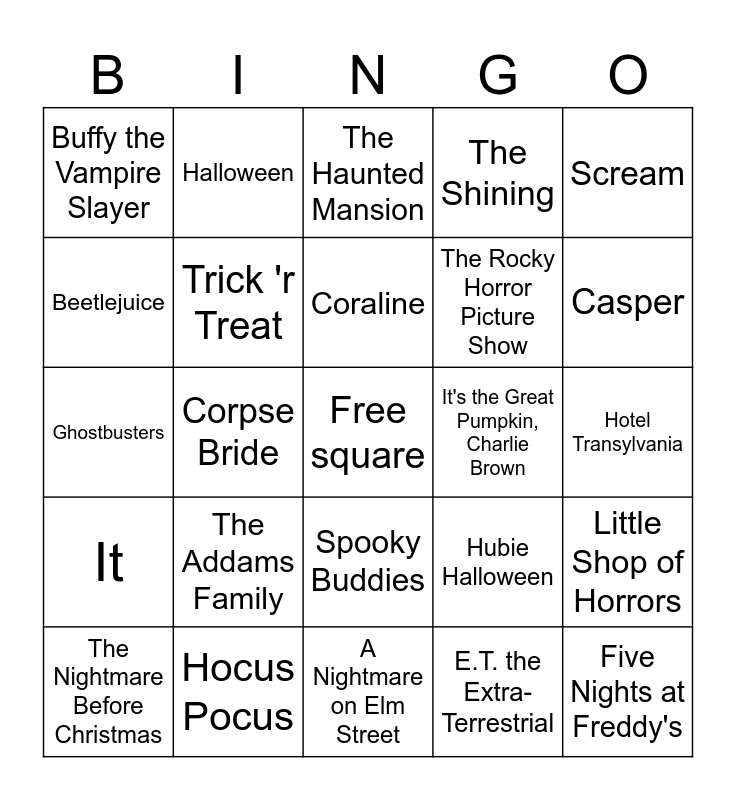 This bingo card has a free space and 24 words: The Addams Family, Hocus Pocus, Coraline, The Nightmare Before Christmas, Scream, Buffy the Vampire Slayer, Beetlejuice, Halloween, It's the Great Pumpkin, Charlie Brown, Spooky Buddies, The Rocky Horror Picture Show, Ghostbusters, Hubie Halloween, Little Shop of Horrors, Trick 'r Treat, E.T. the Extra-Terrestrial, Hotel Transylvania, The Haunted Mansion, Casper, Corpse Bride, Five Nights at Freddy's, It, The Shining and A Nightmare on Elm Street.