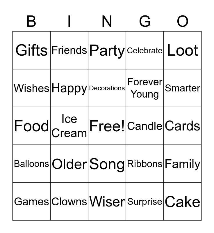 This bingo card has a free space and 24 words: Older, Clowns, Decorations, Games, Loot, Gifts, Wishes, Friends, Candle, Song, Forever Young, Food, Ribbons, Family, Happy, Surprise, Cards, Party, Smarter, Ice Cream, Cake, Balloons, Celebrate and Wiser.