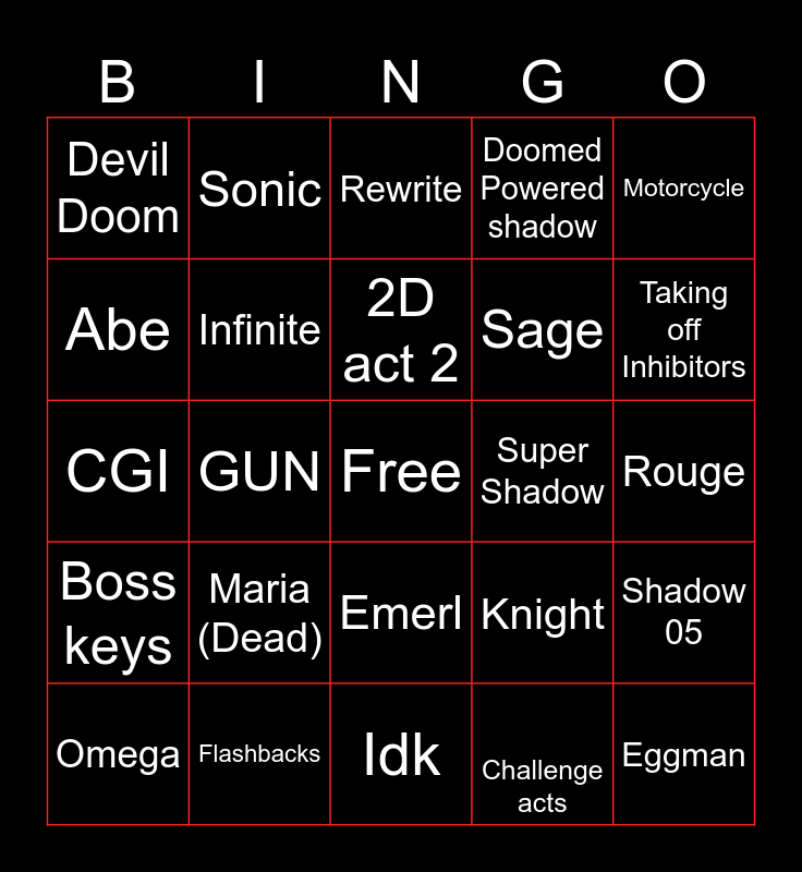 This bingo card has a free space and 24 words: Maria (Dead), Flashbacks, 2D act 2, Omega, Motorcycle, Devil Doom, Abe, Sonic, Super Shadow, Emerl, Sage, CGI, Knight, Shadow 05, Infinite, Challenge acts, Rouge, Rewrite, Taking off Inhibitors, GUN, Eggman, Boss keys, Doomed Powered shadow and Idk.