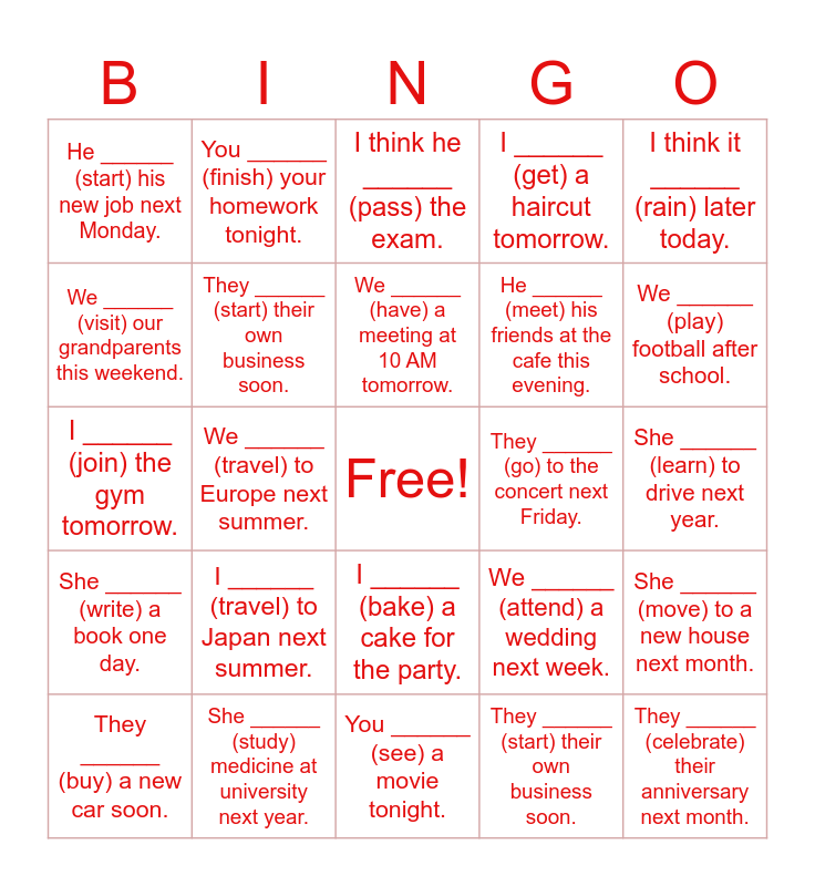 This bingo card has a free space and 24 words: I ______ (travel) to Japan next summer., She ______ (study) medicine at university next year., We ______ (have) a meeting at 10 AM tomorrow., They ______ (buy) a new car soon., I think it ______ (rain) later today., He ______ (start) his new job next Monday., We ______ (visit) our grandparents this weekend., You ______ (finish) your homework tonight., They ______ (go) to the concert next Friday., I ______ (bake) a cake for the party., He ______ (meet) his friends at the cafe this evening., I ______ (join) the gym tomorrow., We ______ (attend) a wedding next week., She ______ (move) to a new house next month., They ______ (start) their own business soon., They ______ (start) their own business soon., She ______ (learn) to drive next year., I think he ______ (pass) the exam., We ______ (play) football after school., We ______ (travel) to Europe next summer., They ______ (celebrate) their anniversary next month., She ______ (write) a book one day., I ______ (get) a haircut tomorrow. and You ______ (see) a movie tonight..