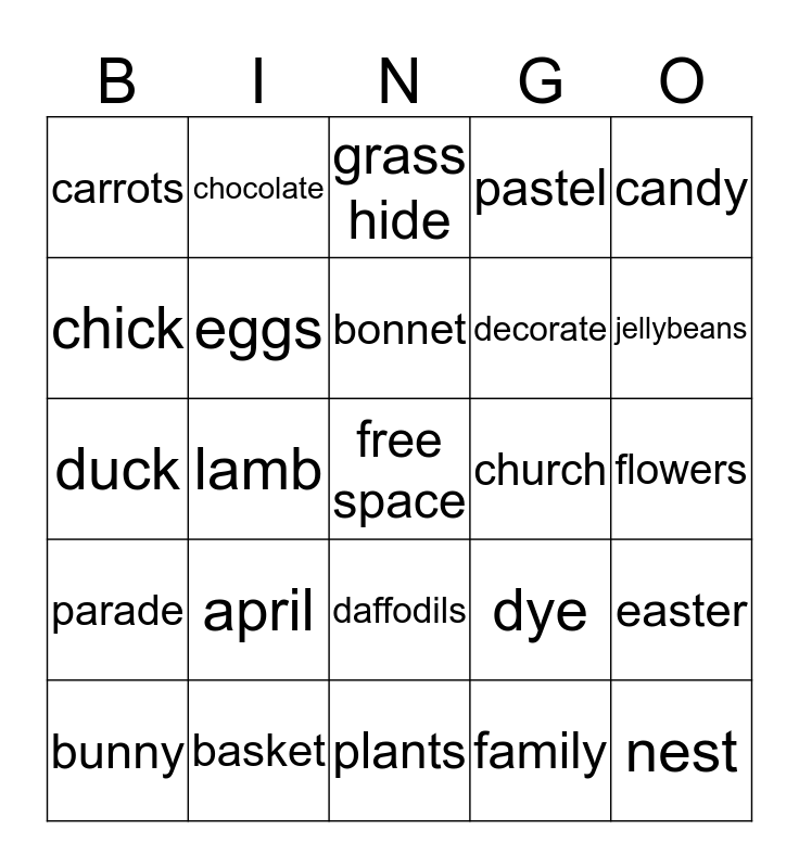 This bingo card has a free space and 24 words: april, basket, bonnet, bunny, candy, carrots, chick, chocolate, church, daffodils, decorate, duck, dye, easter, eggs, family, flowers, grass hide, jellybeans, lamb, nest, parade, pastel and plants.