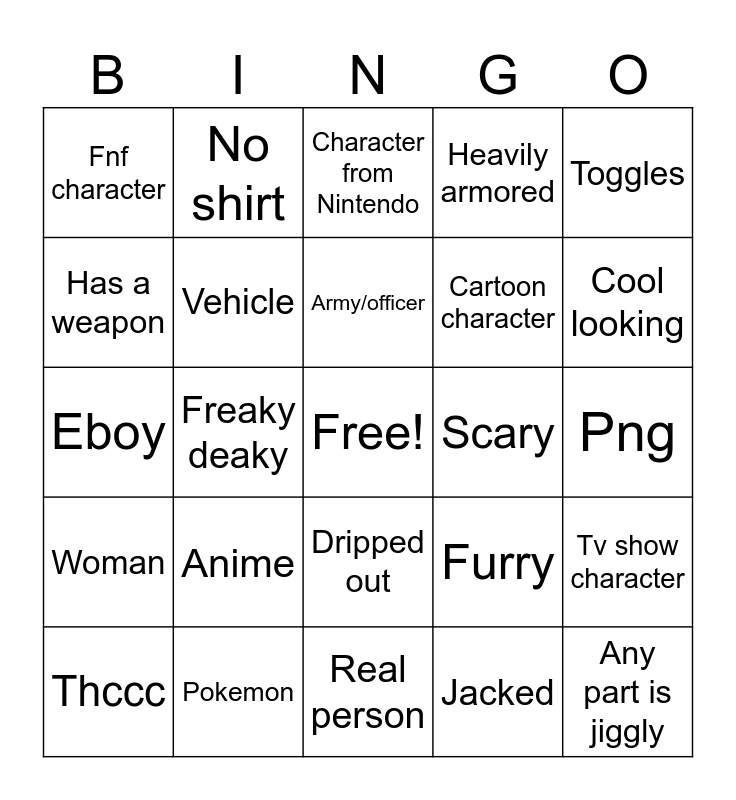 This bingo card has a free space and 24 words: Anime, Pokemon, Army/officer, Thccc, Toggles, Fnf character, Has a weapon, No shirt, Scary, Dripped out, Cartoon character, Eboy, Furry, Tv show character, Vehicle, Jacked, Png, Character from Nintendo, Cool looking, Freaky deaky, Any part is jiggly, Woman, Heavily armored and Real person.