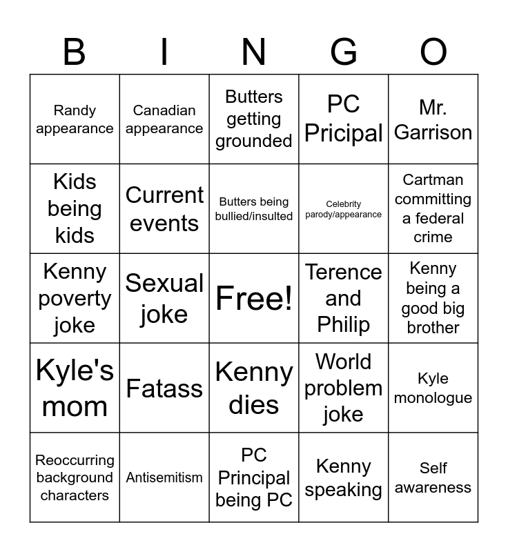This bingo card has a free space and 24 words: Fatass, Antisemitism, Butters being bullied/insulted, Reoccurring background characters, Mr. Garrison, Randy appearance, Kids being kids, Canadian appearance, Terence and Philip, Kenny dies, Celebrity parody/appearance, Kenny poverty joke, World problem joke, Kyle monologue, Current events, Kenny speaking, Kenny being a good big brother, Butters getting grounded, Cartman committing a federal crime, Sexual joke, Self awareness, Kyle's mom, PC Pricipal and PC Principal being PC.