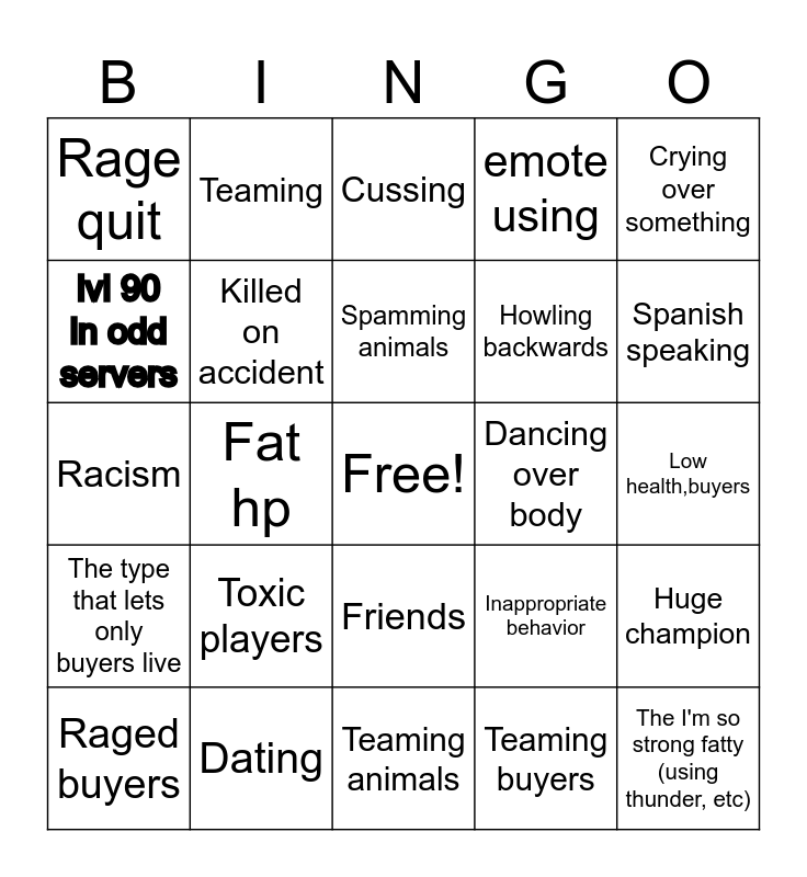 This bingo card has a free space and 24 words: Toxic players, Dating, Spamming animals, Raged buyers, Crying over something, Rage quit, lvl 90 in odd servers, Teaming, Dancing over body, Friends, Howling backwards, Racism, Inappropriate behavior, Huge champion, Killed on accident, Teaming buyers, Low health,buyers, Cussing, Spanish speaking, Fat hp, The I'm so strong fatty (using thunder, etc), The type that lets only buyers live, emote using and Teaming animals.