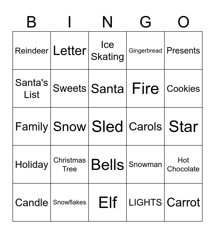 This bingo card has 25 words: Christmas Tree, Elf, Santa, Candle, Presents, Reindeer, Santa's List, Letter, Carols, Bells, Fire, Family, Snowman, Hot Chocolate, Sweets, Carrot, Star, Ice Skating, Cookies, Snow, Sled, Snowflakes, Holiday, Gingerbread and LIGHTS.