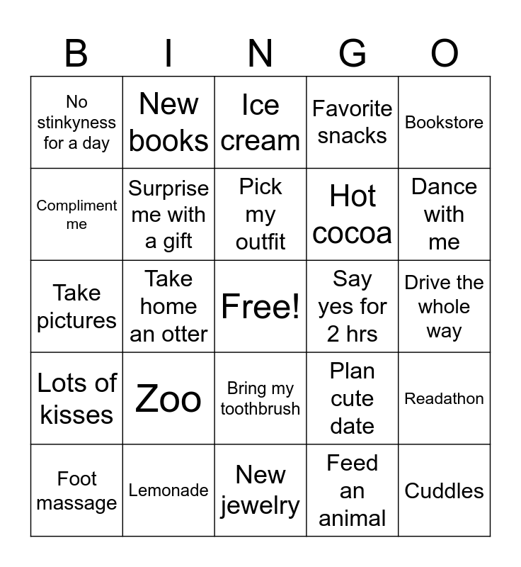 This bingo card has a free space and 24 words: Zoo, Lemonade, Pick my outfit, Foot massage, Bookstore, No stinkyness for a day, Compliment me, New books, Say yes for 2 hrs, Bring my toothbrush, Hot cocoa, Take pictures, Plan cute date, Readathon, Surprise me with a gift, Feed an animal, Drive the whole way, Ice cream, Dance with me, Take home an otter, Cuddles, Lots of kisses, Favorite snacks and New jewelry.
