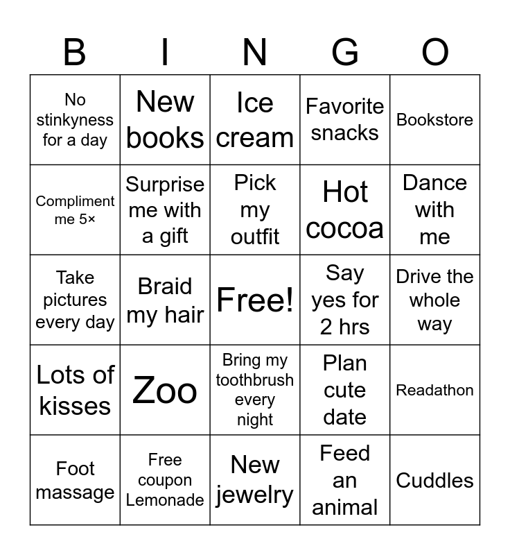 This bingo card has a free space and 24 words: Zoo, Free coupon Lemonade, Pick my outfit, Foot massage, Bookstore, No stinkyness for a day, Compliment me 5×, New books, Say yes for 2 hrs, Bring my toothbrush every night, Hot cocoa, Take pictures every day, Plan cute date, Readathon, Surprise me with a gift, Feed an animal, Drive the whole way, Ice cream, Dance with me, Braid my hair, Cuddles, Lots of kisses, Favorite snacks and New jewelry.