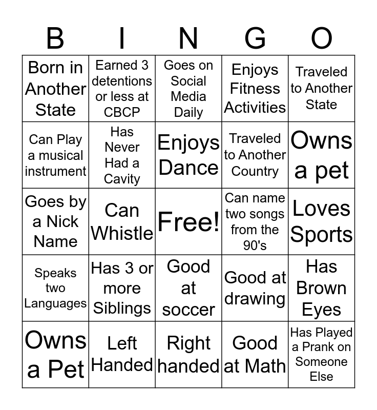This bingo card has a free space and 24 words: Has 3 or more Siblings, Left Handed, Enjoys Dance, Owns a Pet, Traveled to Another State, Born in Another State, Can Play a musical instrument, Earned 3 detentions or less at CBCP, Can name two songs from the 90's, Good at soccer, Traveled to Another Country, Goes by a Nick Name, Good at drawing, Has Brown Eyes, Has Never Had a Cavity, Good at Math, Loves Sports, Goes on Social Media Daily, Owns a pet, Can Whistle, Has Played a Prank on Someone Else, Speaks two Languages, Enjoys Fitness Activities and Right handed.