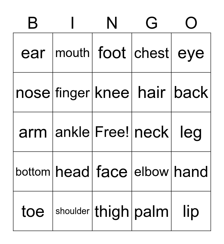 This bingo card has a free space and 24 words: head, shoulder, knee, toe, eye, ear, nose, mouth, neck, face, hair, arm, elbow, hand, finger, palm, leg, foot, back, ankle, lip, bottom, chest and thigh.