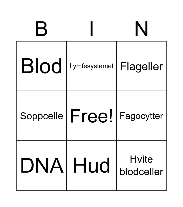 This bingo card has a free space and 23 words: Slimhinne, Kroppsvæske, Hud, Sirkulasjonssystem, Hvite blodceller, Blod, Fagocytter, Lymfesystemet, Lymfevæske, Bakterier, Virus, Sopp, Parasitter, Infeksjon, Indre immunforsvar, Ytre immunforsvar, Flageller, Proteinkapsel, DNA, Dyrecelle, Soppcelle, Plantecelle and Malaria.