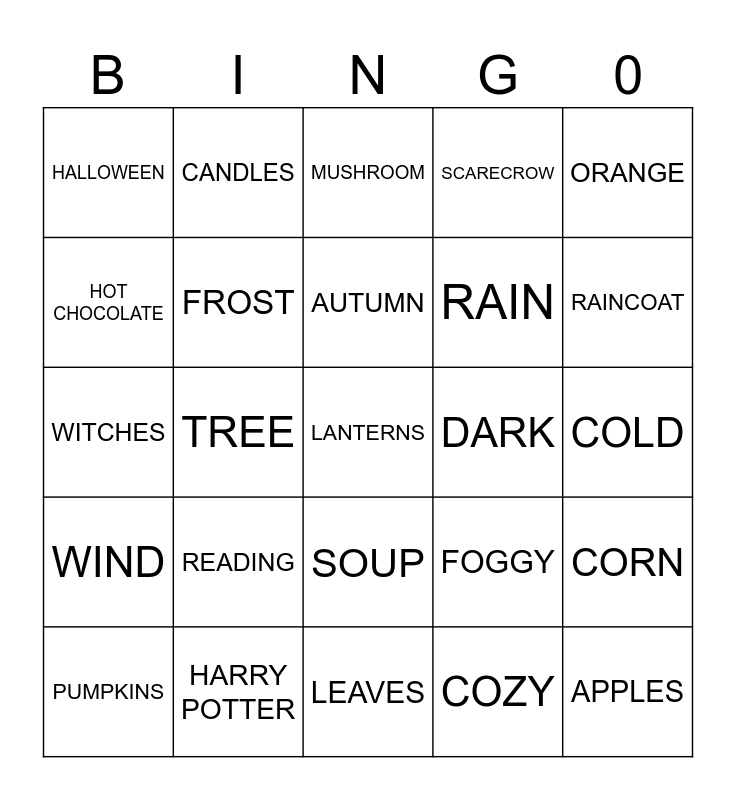 This bingo card has 25 words: READING, LEAVES, AUTUMN, PUMPKINS, ORANGE, HALLOWEEN, HOT CHOCOLATE, CANDLES, DARK, SOUP, RAIN, WITCHES, FOGGY, CORN, FROST, APPLES, COLD, MUSHROOM, RAINCOAT, TREE, LANTERNS, HARRY POTTER, WIND, SCARECROW and COZY.