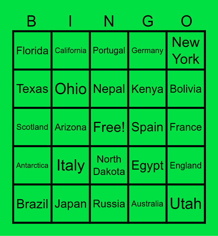This bingo card has a free space and 24 words: Brazil, Italy, Nepal, Australia, New York, Florida, California, Portugal, Spain, France, Scotland, Ohio, Egypt, England, Texas, Japan, Russia, Germany, Bolivia, Antarctica, Arizona, North Dakota, Kenya and Utah.