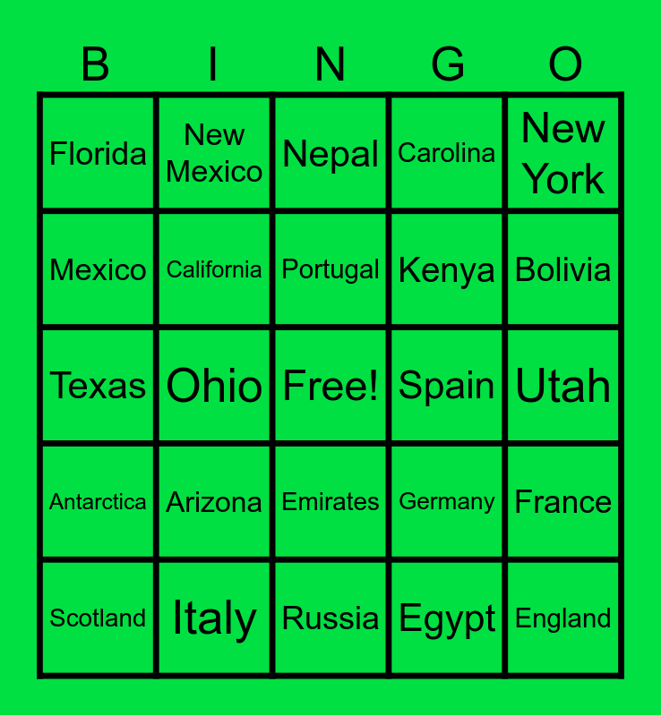 This bingo card has a free space and 29 words: Brazil, Italy, Nepal, Australia, New York, Florida, California, Portugal, Spain, France, Scotland, Ohio, Egypt, England, Texas, Japan, Russia, Germany, Bolivia, Antarctica, Arizona, North Dakota, Kenya, Utah, Mexico, New Mexico, Emirates, Carolina and Romania.