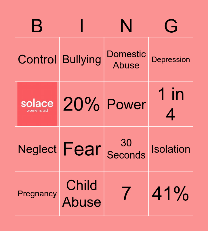 This bingo card has 1 images and 15 words: Child Abuse, Isolation, Domestic Abuse, Control, Neglect, Bullying, 30 Seconds, 7, 20%, Pregnancy, Depression, Fear, 1 in 4, Power and 41%.