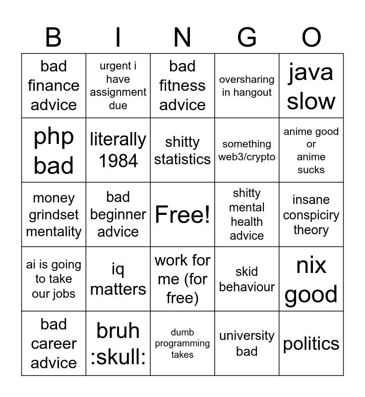 This bingo card has a free space and 24 words: iq matters, bruh :skull:, shitty statistics, bad career advice, java slow, bad finance advice, php bad, urgent i have assignment due, shitty mental health advice, work for me (for free), something web3/crypto, money grindset mentality, skid behaviour, nix good, literally 1984, university bad, insane conspiciry theory, bad fitness advice, anime good or anime sucks, bad beginner advice, politics, ai is going to take our jobs, oversharing in hangout and dumb programming takes.