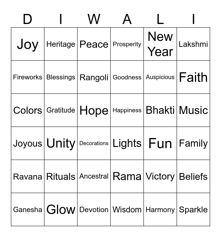 This bingo card has 60 words: Festival, Lights, Celebration, Happiness, Family, Tradition, Fireworks, Diyas, Rangoli, Gifts, Prosperity, Wealth, Lakshmi, Ganesha, Puja, Joy, Colors, New Year, Sweets, Blessings, Gratitude, Peace, Decorations, Unity, Culture, Glow, Victory, Triumph, Goodness, Wisdom, Forgiveness, Friends, Vibrant, Holidays, Heritage, Rituals, Worship, Faith, Devotion, Auspicious, Sacred, Bhakti, Hope, Kindness, Joyous, Rama, Ayodhya, Mythology, Dance, Music, Fun, Home, Sparkle, Ancestral, Beliefs, Harmony, Positivity, Lamps, Ravana and Good.