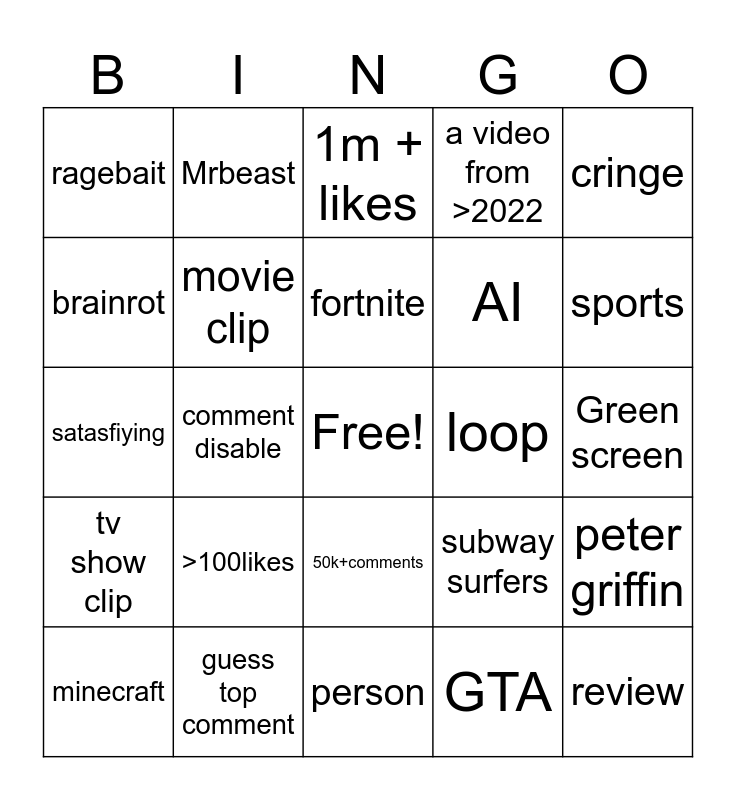 This bingo card has a free space and 24 words: >100likes, guess top comment, fortnite, minecraft, cringe, ragebait, brainrot, Mrbeast, loop, 50k+comments, AI, satasfiying, subway surfers, peter griffin, movie clip, GTA, Green screen, 1m + likes, sports, comment disable, review, tv show clip, a video from >2022 and person.