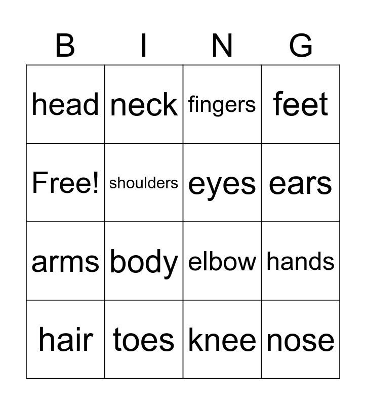 This bingo card has 16 words: toes, hands, fingers, head, arms, neck, elbow, knee, Free!, shoulders, hair, feet, body, ears, eyes and nose.