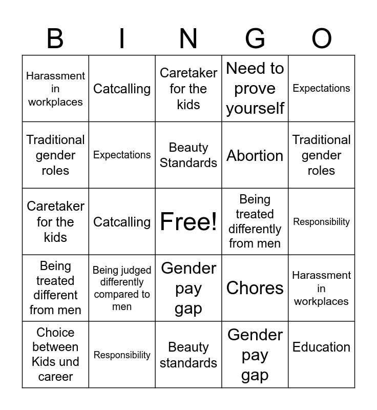 This bingo card has a free space and 24 words: Being judged differently compared to men, Responsibility, Beauty Standards, Choice between Kids und career, Expectations, Harassment in workplaces, Traditional gender roles, Catcalling, Being treated differently from men, Gender pay gap, Abortion, Caretaker for the kids, Chores, Harassment in workplaces, Expectations, Gender pay gap, Responsibility, Caretaker for the kids, Traditional gender roles, Catcalling, Education, Being treated different from men, Need to prove yourself and Beauty standards.