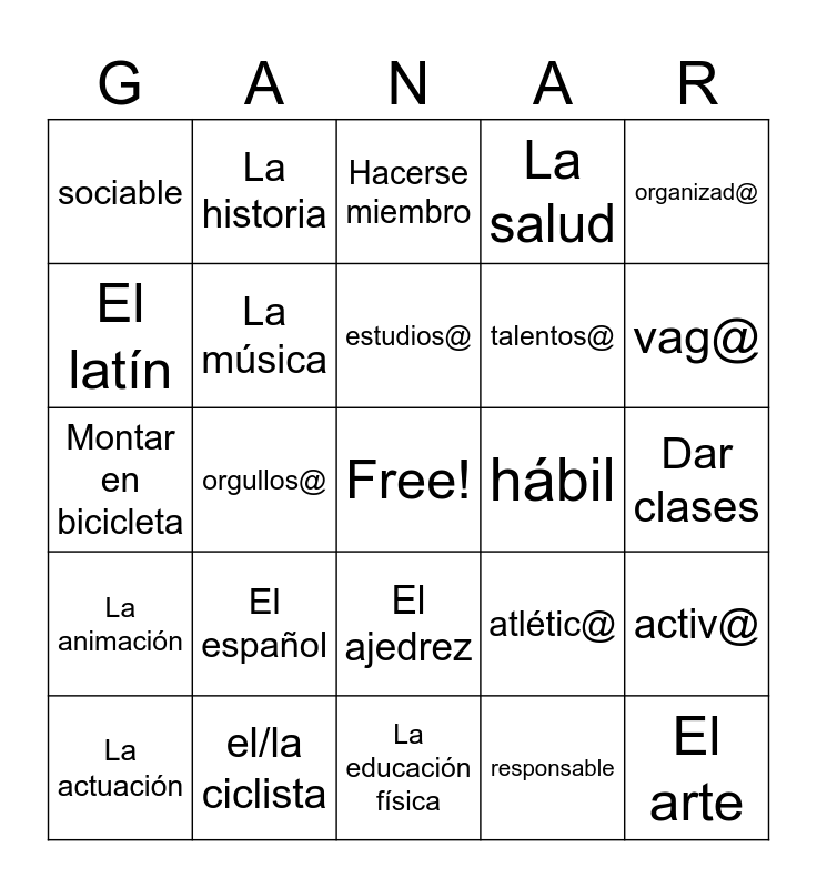 This bingo card has a free space and 48 words: El alemán, El arte, Las ciencias, La educación física, El español, El francés, La historia, El inglés, El latín, Las matemáticas, La música, La salud, activ@, atlétic@, curios@, estrict@, estudios@, hábil, motivad@, organizad@, orgullos@, responsable, sociable, talentos@, trabajador(a/e), vag@, La actuación, actuar, El ajedrez, La animación, el/la atlet@, La banda, el/la beisbolista, el/la softbolista, el/la ciclista, El consejo estudiantil, El coro, Dar clases, dedicar, Depender (de), El ensayo, Establecer (xc), Hacerse miembro, El jugador/La jugadora, Montar en bicicleta, El músico/La músico, La orquesta and Pertenecer (zc).