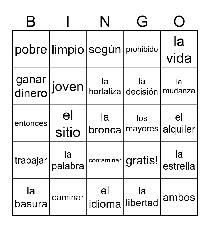 This bingo card has 25 words: la palabra, el idioma, la hortaliza, la basura, la vida, pobre, ganar dinero, limpio, los mayores, contaminar, la decisión, entonces, gratis!, la estrella, joven, ambos, el alquiler, según, la mudanza, el sitio, la bronca, caminar, trabajar, prohibido and la libertad.