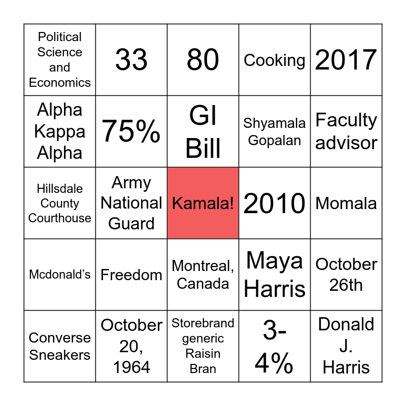 This bingo card has a free space and 54 words: Lotus Flower, Mcdonald’s, Doug, Nacho Cheese Doritos, Montreal, Canada, Oakland, California, Cooking, Diplomat, Alpha Kappa Alpha, Howard University, Political Science and Economics, University of California, October 20, 1964, Converse Sneakers, Miller High Life, Storebrand generic Raisin Bran, Donald J. Harris, Shyamala Gopalan, University of California Berkeley, Momala, Maya Harris, Three, 2010, 2017, $20 billion, 33, 7-10%, 2 Votes, 1 of 11, 3-4%, 10, 704, 0.3%, 183, 3,000, 80, 14, Hillsdale County Courthouse, October 26th, 8pm, 75%, Ballot Drop Box, Pheasant, Largest Tax Cut, State Championship, Freedom, Joy, Volunteers, Time, GI Bill, Army National Guard, Faculty advisor, Texas, Norway, Minnesota, Italy, Valentine, Nebraska and Coconut.