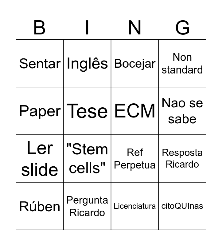 This bingo card has 16 words: Pergunta Ricardo, Resposta Ricardo, Bocejar, Sentar, Ler slide, Inglês, Ref Perpetua, Licenciatura, Paper, Tese, Rúben, Non standard, "Stem cells", Nao se sabe, ECM and citoQUInas.
