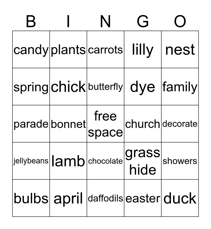 This bingo card has a free space and 30 words: april, basket, bonnet, bunny, candy, carrots, chick, chocolate, church, daffodils, decorate, duck, easter, eggs, family, flowers, grass hide, jellybeans, lamb, nest, parade, pastel, plants, dye, spring, lilly, showers, bulbs, butterfly and green.